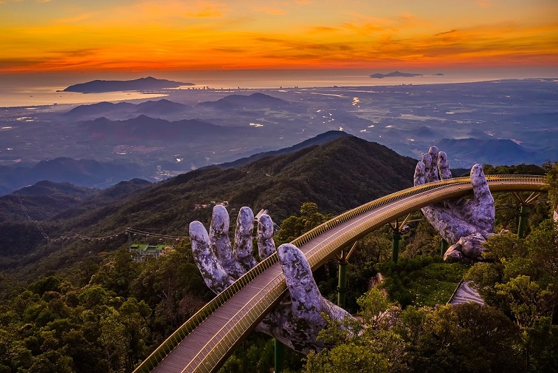 Mới được khai trương vào tháng 6/2018, cây cầu vàng này có thể nói là một điểm nhấn ở Bà Nà Hill với chiều dài gần 150m, được nâng đỡ bởi đôi bàn tay khổng lồ giúp cho bạn có thể dễ dàng di chuyển từ chân núi hay làng Pháp đến vườn hoa Le Jardin D’Amour (vườn thiên thai). Ý nghĩa của cây cầu này chính là thần núi đang giúp người dân có thể thuận lợi đến được vườn thiên thai dễ dàng hơn thay vì phải băng rừng, lội suối. Mấy bạn thích chụp hình sống ảo chắc chắn sẽ vô cùng thích địa điểm du lịch hấp dẫn ở Bà Nà Hill này đó nha.